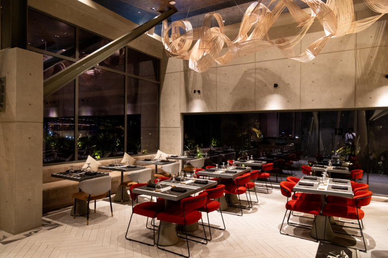 Set above the bustle, the bistro opens into an airy, open-sky setting defined by warm